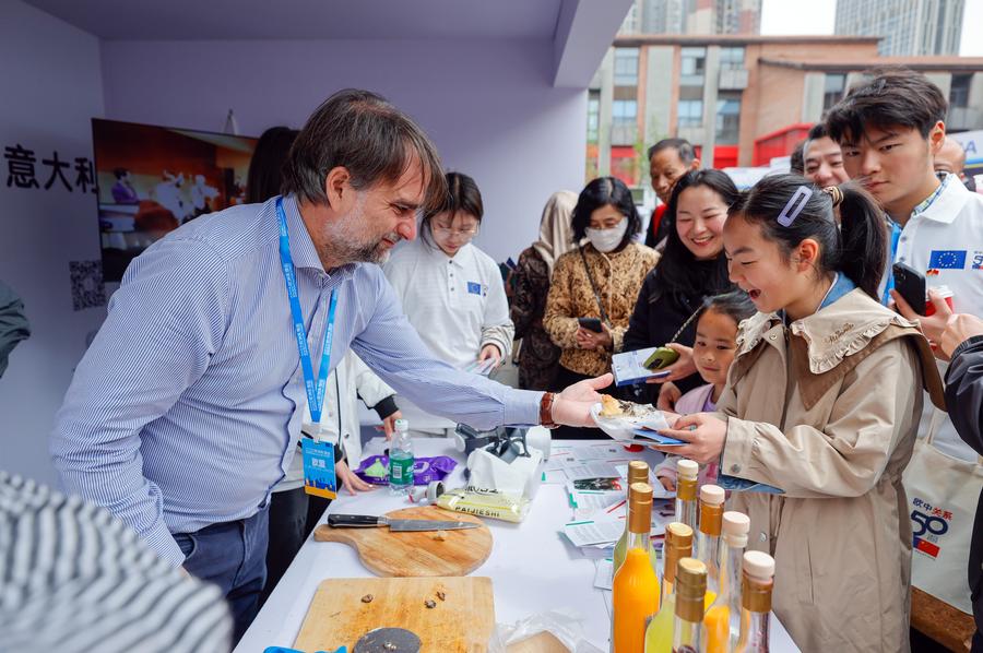 Besucher probieren Pizza am Stand Italiens auf der Chengdu Europe Culture Season & European Culture Street 2025 in Chengdu in der südwestchinesischen Provinz Sichuan, am 12. April 2025. (Xinhua/Shen Bohan)