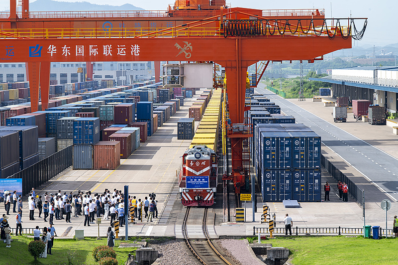 Ein Güterzug f?hrt am 18. Juni 2025 von Jinhua, der ostchinesischen Provinz Zhejiang, nach Aserbaidschan. (China News Service)