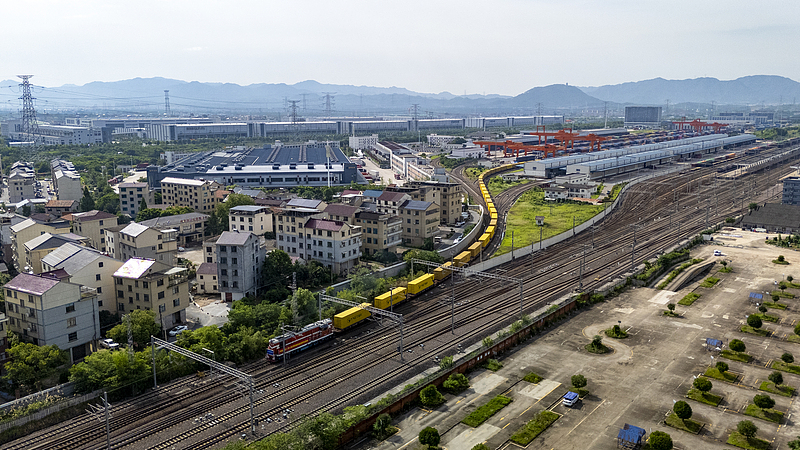Diese Luftaufnahme zeigt einen Güterzug, der am 18. Juni 2025 von Jinhua in der ostchinesischen Provinz Zhejiang nach Aserbaidschan abf?hrt. (China News Service)