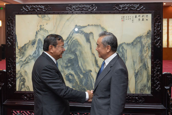 Beim Treffen mit Prak Sokhonn bekr?ftigte Wang, China und Kambodscha seien eiserne Freunde, zwischen beiden L?ndern bestehe eine Allwetter-Partnerschaft mit geteilter Zukunft. China unterstütze Kambodscha bei der Aufrechterhaltung der politischen Stabilit?t, der F?rderung der Wirtschaftsentwicklung sowie bei der Erh?hung des Lebensstandards der Bev?lkerung. Es sei zu hoffen, dass die chinesisch-kambodschanische Zusammenarbeit beiden V?lkern mehr Vorteile bringen sowie zur Entwicklung und Prosperit?t in der Region beitragen werde.
