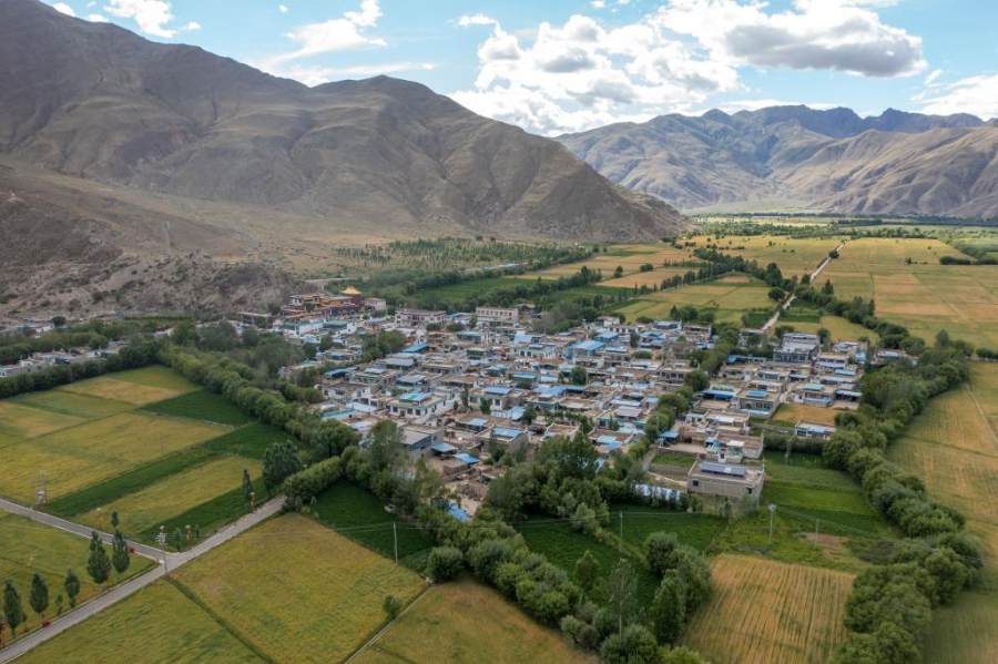 Im Wohnviertel Tashi Choden der Gemeinde Trandruk des Bezirks Nedong der Stadt Lhoka sind zahlreiche kleine Wohngeb?ude tibetischen Stils in dichten Reihen zu sehen. Touristen nehmen Fotos auf Alleen im Dorf und in üppigen Weizenfeldern auf.…