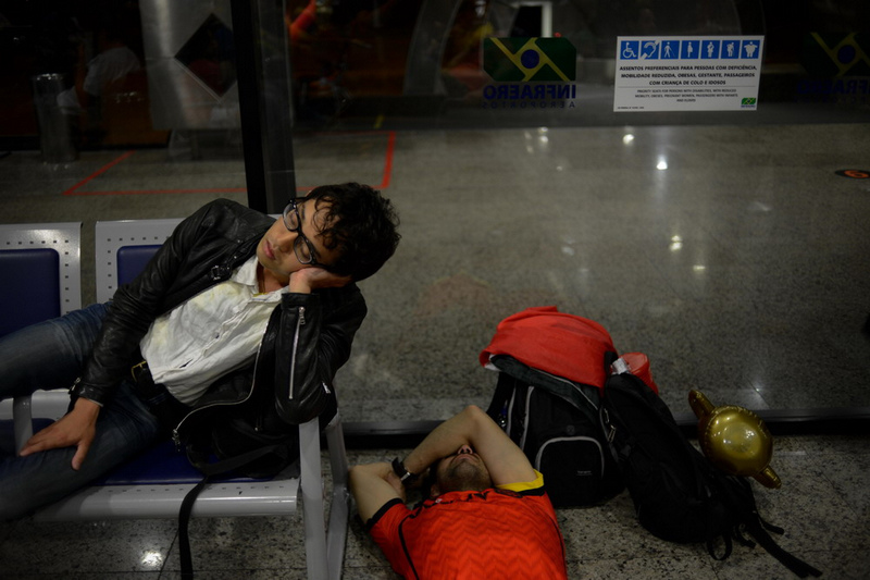 Auf dem Flughafen in Fortaleza schlafen die Fu?ballfans direkt auf den Sitzen oder sogar auf dem Boden. |