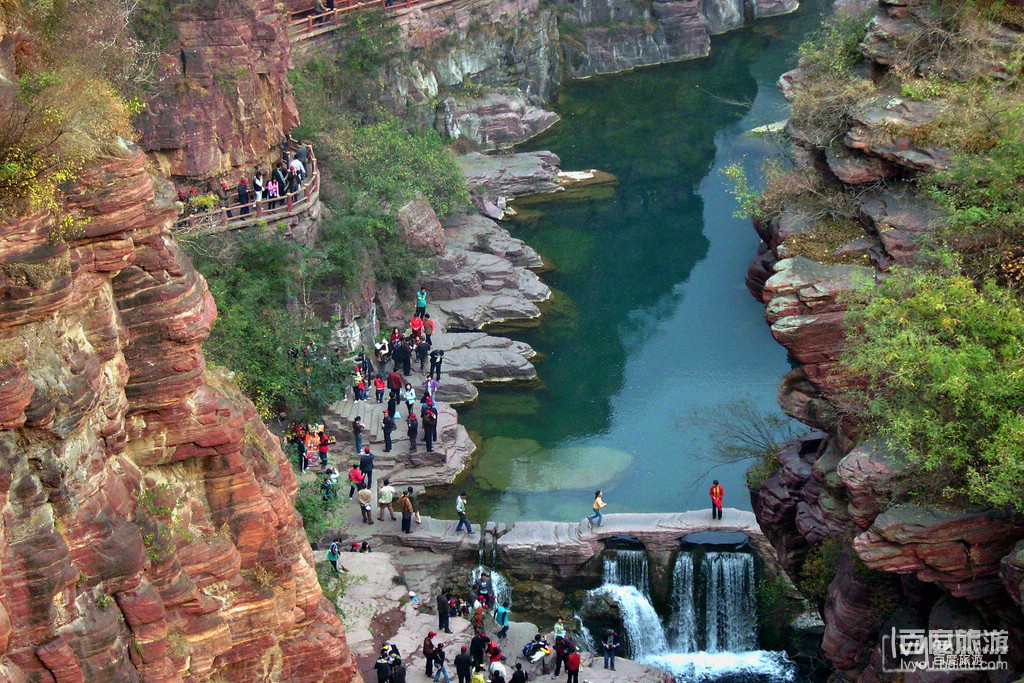 Die Rotstein-Schlucht liegt im Yuxi-Tal am Fu?e des Roten Berges nahe der Gro?en Mauer aus der Ming-Dynastie, rund fünf Kilometer n?rdlich der Stadt Yulin. Da auf dem Berg überall rote Steine zu sehen sind, erhielt die Schlucht den Namen ?Rotstein“. An ihrer Ostflanke befindet sich der Xiongshan-Tempel, der w?hrend der Song- (960 bis 1279) und der Yuan-Dynastie (1206 bis 1368) errichtet wurde. Die Tempelanlage besteht aus mehr als zehn Hallen, die alle in den Fels gehauen wurden. In der Schlucht selbst sieht man grüne B?ume, sauberes Wasser, sch?ne Landschaften und einen einmaligen Sonnenuntergang. Der Sonnenuntergang auf dem Roten Berg geh?rt zu den bekanntesten acht Naturlandschaften von Yulin. Im Altertum kamen Beamte, Gener?le und Gelehrte nach Yulin. Mit ihren Gedichten und Liedern haben sie nicht nur die lokale Schnitzerei inspiriert, sondern auch die chinesische Kalligrafie.