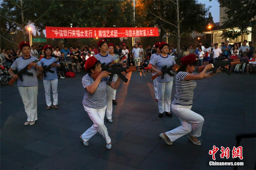 Auf dem Platz vor der ?Raffles City“ in Beijing führen einige Frauen und M?nner mittleren Alters jeden Tag einen Tanz auf, der an den anti-japanischen Krieg erinnert. |