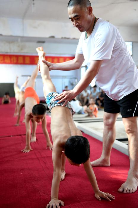 In einem Trainingszentrum für Kunstturner in der Stadt Haozhou (Provinz Anhui) feilen die Nachwuchstalente unter der Leitung eines erfahrenen Trainers an ihrer Technik. |