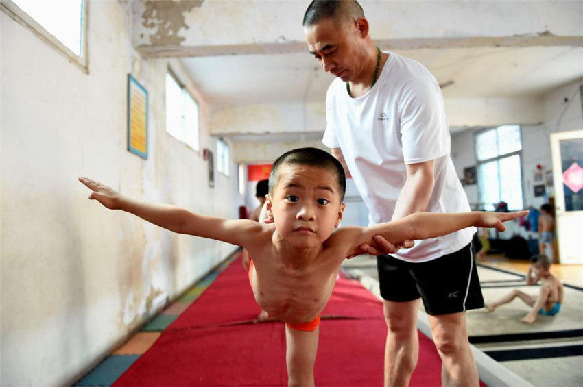 In einem Trainingszentrum für Kunstturner in der Stadt Haozhou (Provinz Anhui) feilen die Nachwuchstalente unter der Leitung eines erfahrenen Trainers an ihrer Technik. |