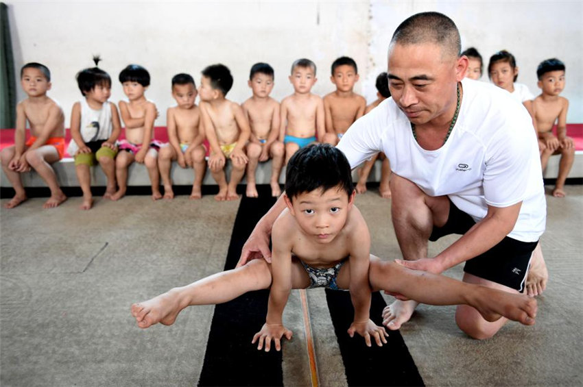In einem Trainingszentrum für Kunstturner in der Stadt Haozhou (Provinz Anhui) feilen die Nachwuchstalente unter der Leitung eines erfahrenen Trainers an ihrer Technik. |