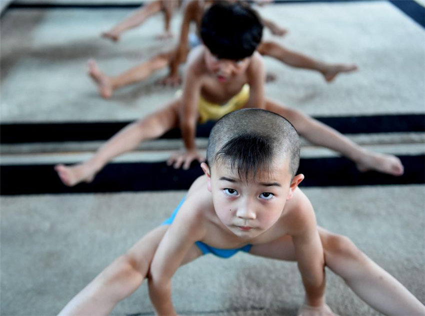 In einem Trainingszentrum für Kunstturner in der Stadt Haozhou (Provinz Anhui) feilen die Nachwuchstalente unter der Leitung eines erfahrenen Trainers an ihrer Technik. |
