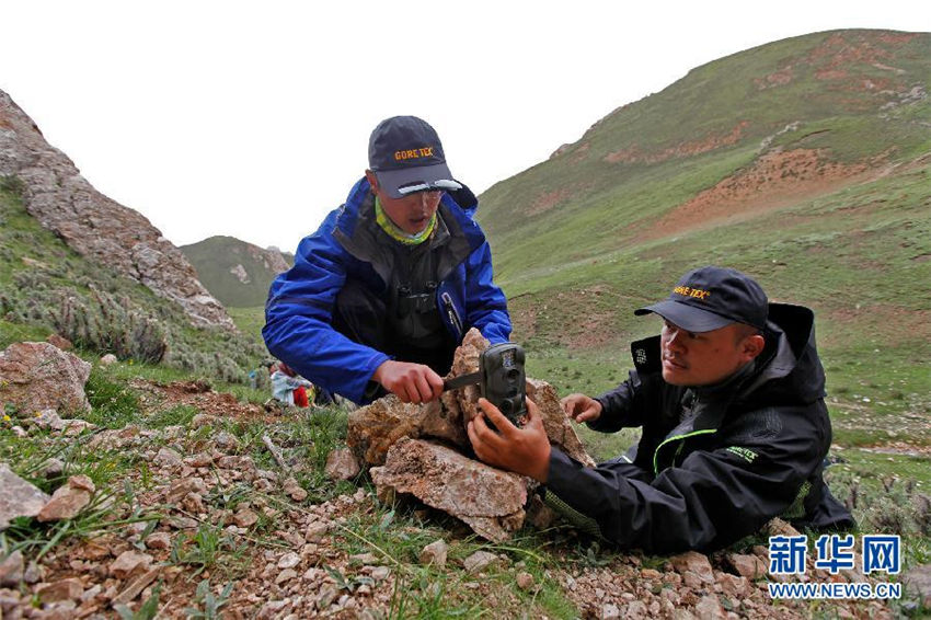 Fotografen des Forschungsinstitutes IBE stellen eine Infrarotkamera zur Aufnahme der Schneeleoparden auf (Foto: Shen Bohan) |