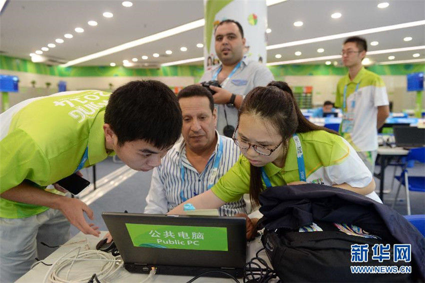 Freiwillige helfen einem ?gyptischen Journalisten bei der Spracheneinstellung auf einem Computer im Medienzentrum. (Chen Yehua) |