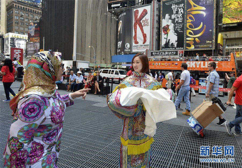 Darsteller der Mei Lanfang-Operntruppe auf dem Times Square in New York |