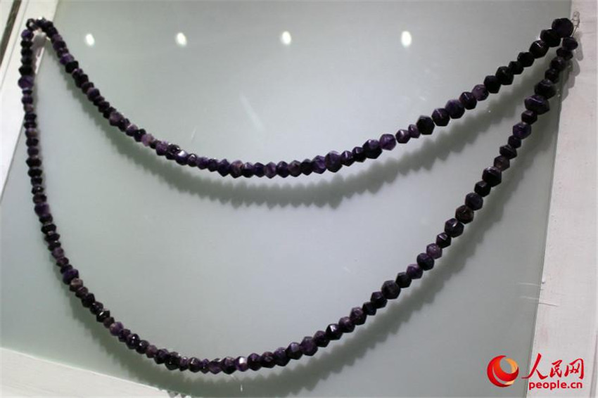 Diese Halskette wurde im Jahr 1991 ausgegraben. Sie besteht aus 163 Perlen aus Amethyst. |