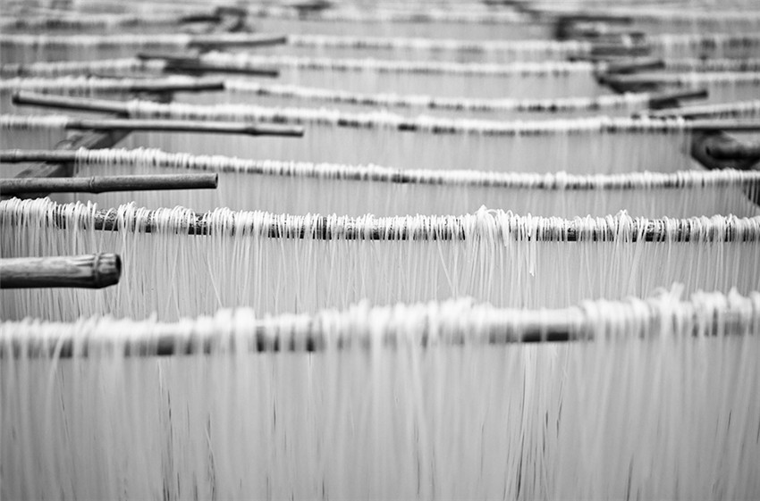 Handgemachte Nudeln h?ngen an den Bambusstangen. |
