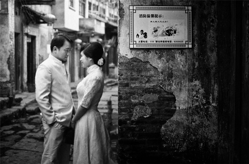 Ein frisch verm?hltes Paar macht Hochzeitsfotos auf der Stra?e. |