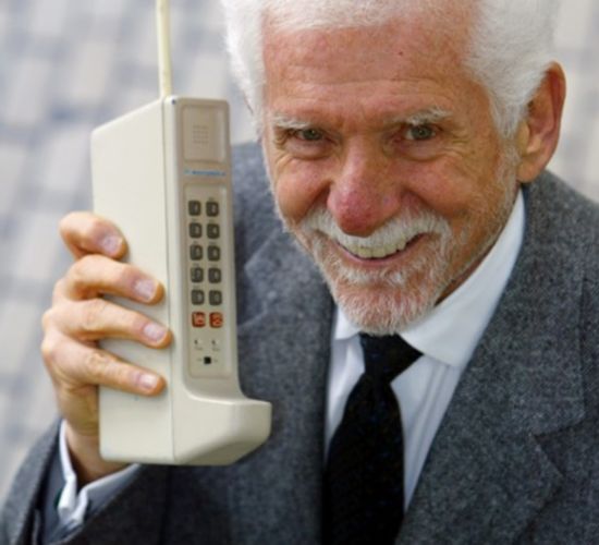 Martin Cooper zeigt stolz das DynaTAC von Motorola, den Originaltyp des weltweit ersten Mobiltelefons. Cooper gilt als Vater des Mobiltelefons. Mit seinem Telefon wurde am 3. April 1973 der erste Anruf auf einem zivilen Handy gemacht. |