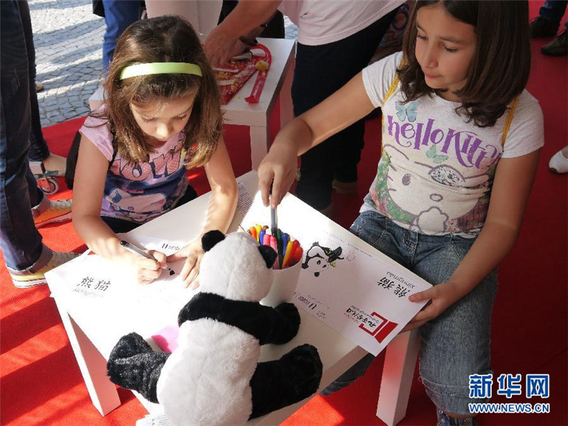 An einer Veranstaltung im portugiesischen Lissabon malen zwei Kinder Pandas. |