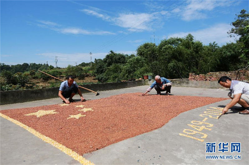 Einige Bauer der Provinz Sichuan stellen mit Sorghum und Mais eine Fünf-Sterne-Flagge zusammen. (Foto: Liu Guangbin) |