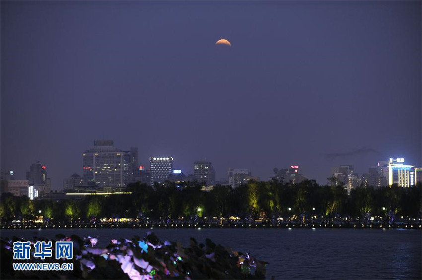 Fotoaufnahme vom Blutmond um 17.57 Uhr gestern Abend am West Lake in Hangzhou (Foto: Ju Huanzong) |
