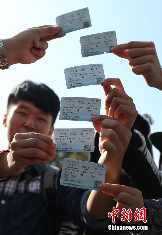 Stolz zeigen die Passagiere ihre Fahrkarten vom Zhonghuamen zum Bahnhof Nanjing. |