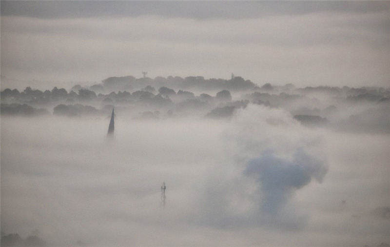 Der Nebel ist so dicht, dass man nur die Kirchturmspitze, einige B?ume und einen Masten sieht. |