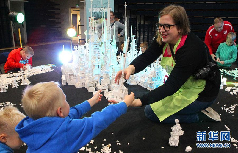 Ein Kind übergibt sein Werk als Teil der ?Lego-Stadt“ einer Lehrerin der Arbeitsgruppe. |
