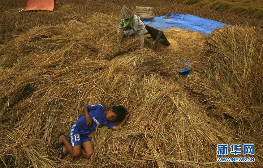 Ein Junge schl?ft, w?hrend seine Mutter das Getreide bündelt (Indonesien, 16. August 2011). |