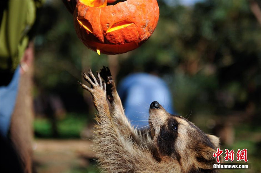 In einem Wildpark in Yunnan starren die Waschb?ren neugierig eine Kürbislaterne an. (Foto: Liu Ranyang) |