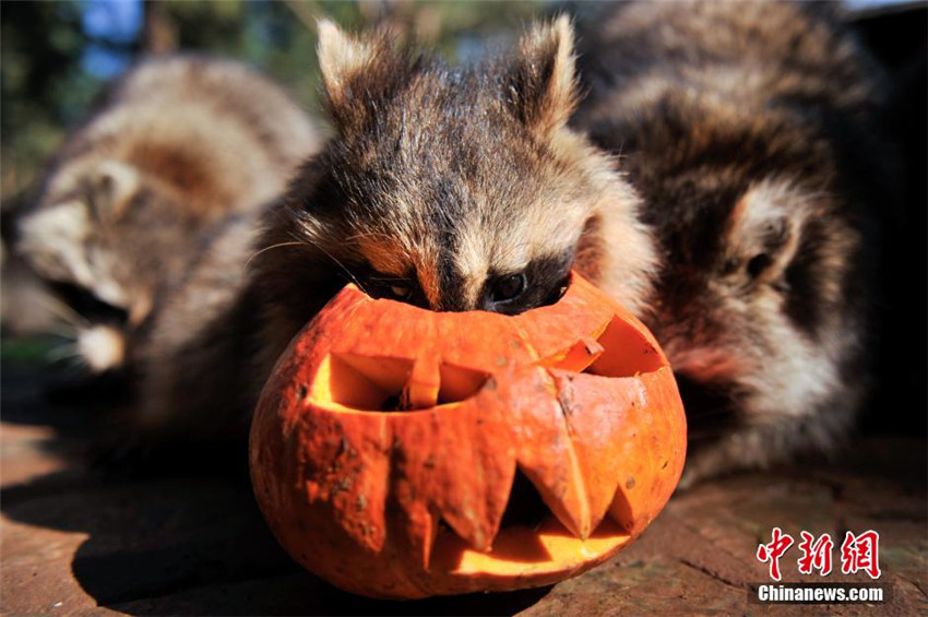 In einem Wildpark in Yunnan starren die Waschb?ren neugierig eine Kürbislaterne an. (Foto: Liu Ranyang) |