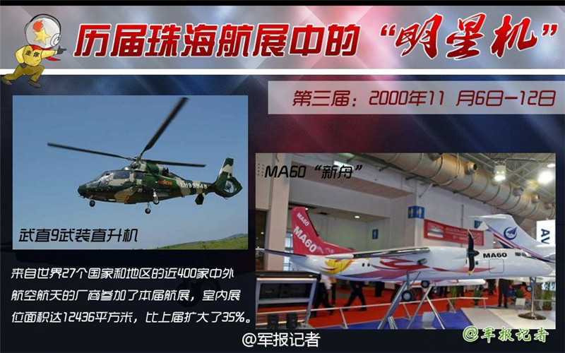 Ein bewaffneter Hubschrauber vom Typ WZ-9 (links) und eine MA60 (rechts) an der dritten Ausstellung in Zhuhai vom 6. bis zum 12. November 2000. |