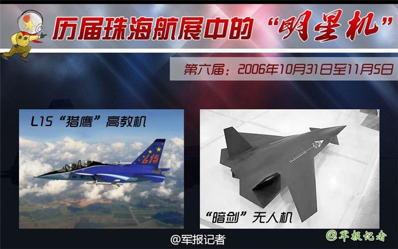 Ein L15-Schulflugzeug (links) und ein unbemanntes Flugzeug vom Typ ?Anjian“ (Dark Sword) an der sechsten Ausstellung in Zhuhai vom 31. Oktober bis zum 5. November 2006. |