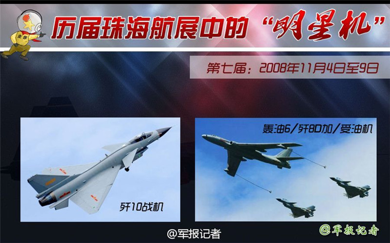 Ein J-10 (links), und ein H-6U-Tankflugzeug mit zwei Kampfjets vom Typ J-10 (rechts) an der siebten Ausstellung in Zhuhai vom 4. bis zum 9. November 2008. |