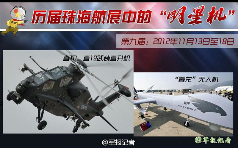 Ein Kampfhubschrauber vom Typ Z-10 (links) und ein unbemannter ?Pterodactylus“ an der neunten Ausstellung in Zhuhai vom 13. bis zum 18. November 2012. |