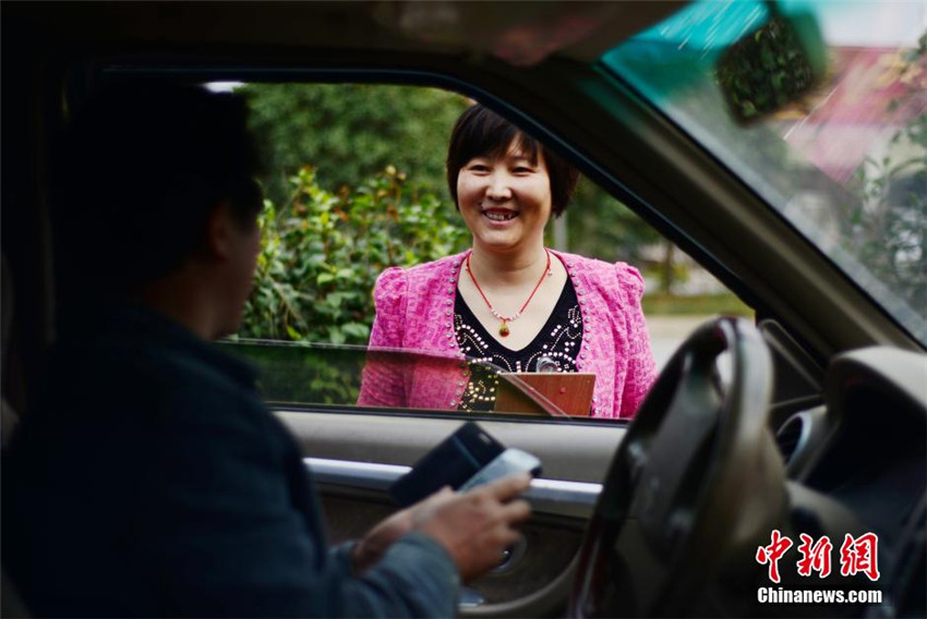 Xing Qiaomei redet l?chelnd mit dem Kunden. |