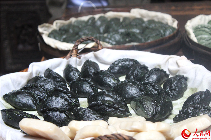 Einwohner des Dorfes zeigen die Herstellung einer Spezialit?t der Region: Die Qingming-Jiaozi werden traditionellerweise w?hrend dem Totengedenkfest gegessen. |