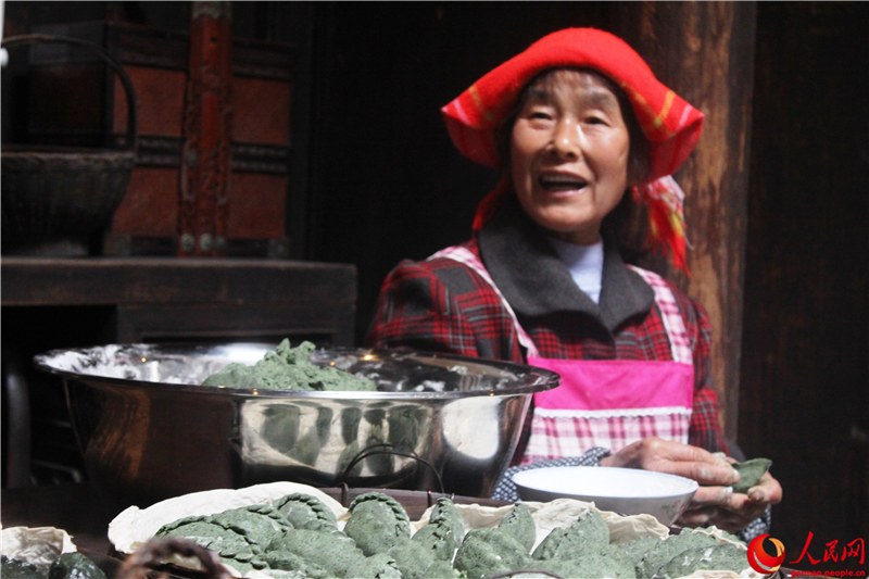 Einwohner des Dorfes zeigen die Herstellung einer Spezialit?t der Region: Die Qingming-Jiaozi werden traditionellerweise w?hrend dem Totengedenkfest gegessen. |