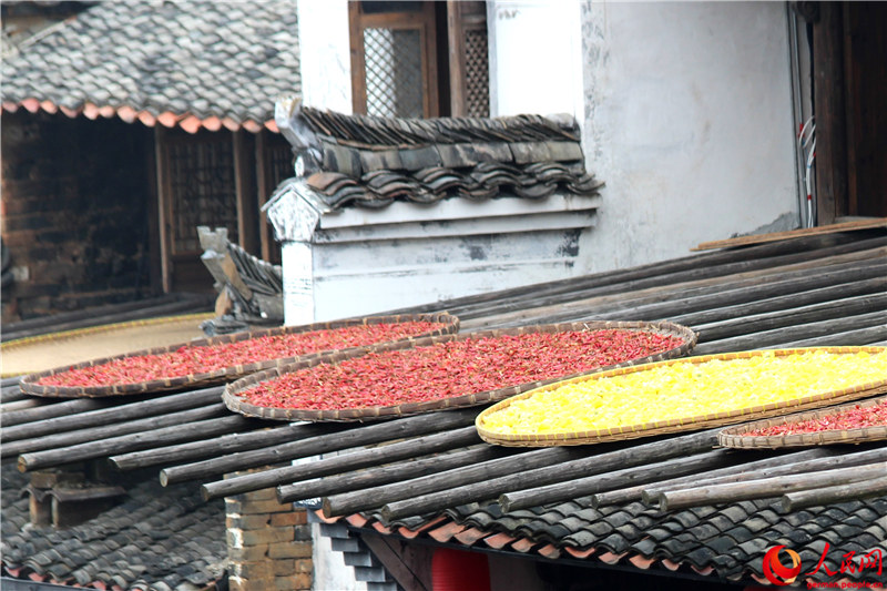 Im Herbst werden rote Chilischoten, orange Kürbisschnitze und gelbe Chrysanthemenblüten zum Trocknen auf die D?cher gelegt. Zusammen ergeben sie eine wunderbare Farbenpracht. |