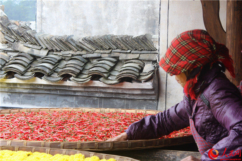 Im Herbst werden rote Chilischoten, orange Kürbisschnitze und gelbe Chrysanthemenblüten zum Trocknen auf die D?cher gelegt. Zusammen ergeben sie eine wunderbare Farbenpracht. |