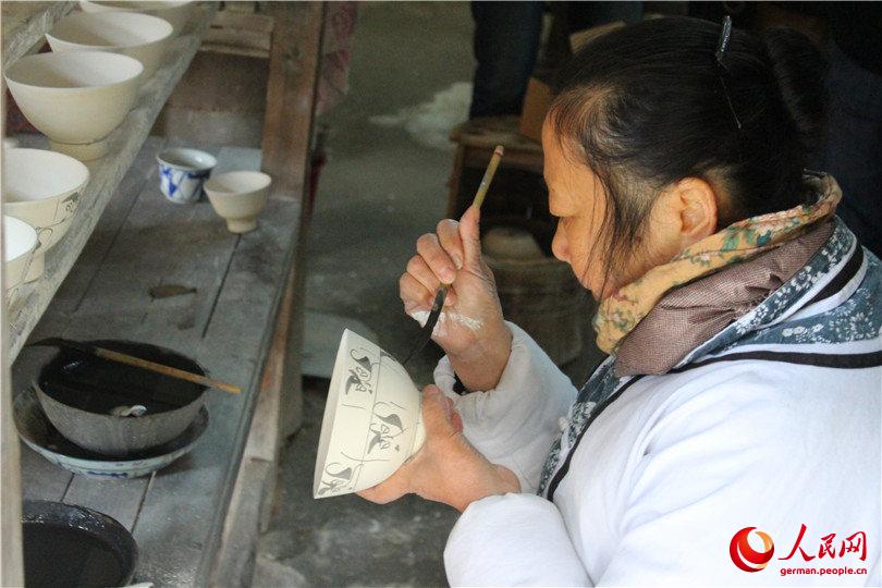 Der letzte Schritt vor dem Brennen: die Bemalung. Die Arbeiterin malt mit einer speziellen Tinte ein Kamelien-Muster auf die Schale. Die schwarze Tinte wird sich w?hrend dem Brennprozess dank einer chemischen Reaktion in eine klare, blaue Farbe umwandeln. |
