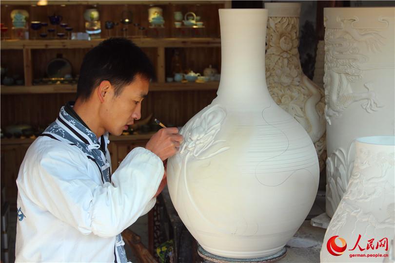 Modellier-Meister Xia Bo arbeitet an einer Porzellanvase. Normalerweise ben?tigt Xia einen Monat für ein komplexes Werk dieser Gr??e. Xia lernte das Modellieren, das mit einer Schnitztechnik verglichen werden kann, als Jugendlicher. Nach etwa vier Jahren war er f?hig, einfache Motive zu gestalten. Für schwierigere Motive wie dasjenige, das er vor Kurzem begonnen hat, braucht es l?ngere Erfahrung. Für seine Arbeit benutzt Xia keine Schablone oder Vorlage – er l?sst seiner Inspiration freien Lauf. |