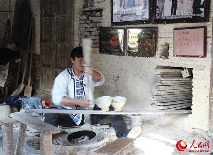Obwohl der wachsame Lehrer die Arbeit seines Z?glings immer noch akribisch überwacht, kann Wang Shaohui inzwischen ohne seinen Gro?vater die Aufgabe der Formgebung übernehmen. Er produziert hier jeden Tag ungef?hr 100 Schalen. |