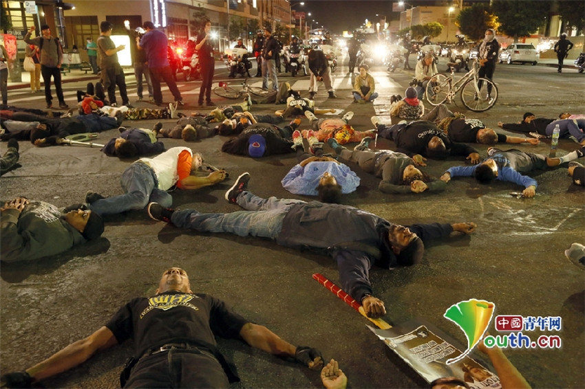 In Beverly Hills (Los Angeles) legen sich die Demonstranten auf die Stra?e, um ihre Wut über den Entscheid der Grand Jury zu zeigen. |
