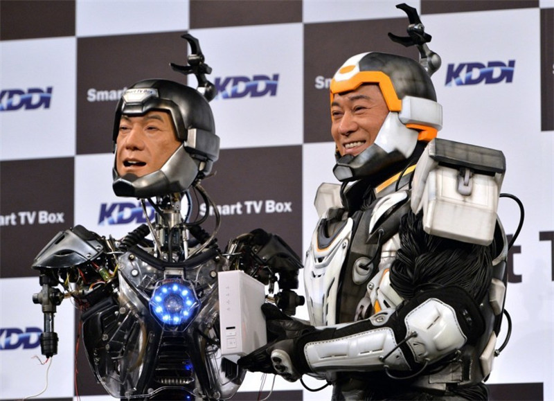 An einer Pressekonferenz am 19. November 2013 trifft der als Roboter verkleidete japanische Darsteller Matsudaira Ken seinen ?hnlich aussehenden ?Bruder“, den Android-Roboter ?Matsuyama“. |