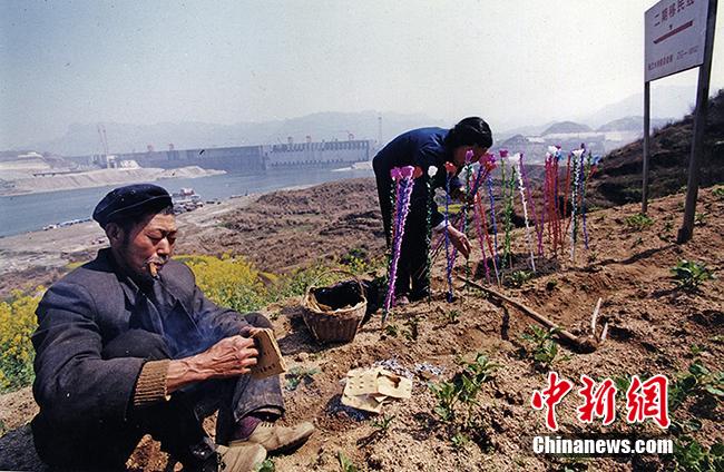 20. M?rz 2001 – Kurz vor dem Totengedenkfest Qingming opfern Zhang Jianguo und seine Frau vor dem Damm ihren Vorfahren. Der Ahnenfriedhof existiert nicht mehr. Die Zhangs geh?ren zu den ersten Bewohnern der neuen Stadt Zigui. |