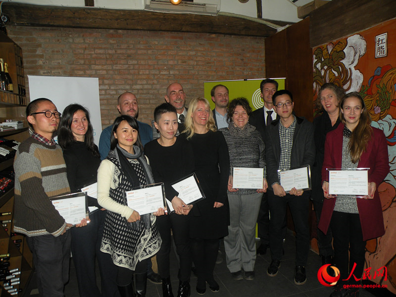 Gruppenfoto der Teilnehmer 2014 mit dem Leiter des Kulturreferats der deutschen Botschaft Peking Enrico Brandt, dem Leiter des Goethe-Instituts Peter Anders, Herrn Caspar Welbergen von der Stiftung Mercator, der Seminarleiterin in Hamburg Dr. Gesa Birnkraut von dem Institut für Kulturkonzepte Hamburg e.V. (Mitte) sowie der Seminarleiterin in Shanghai Katja Hellkoetter von CONSTELLATIONS International (Zweite rechts). |