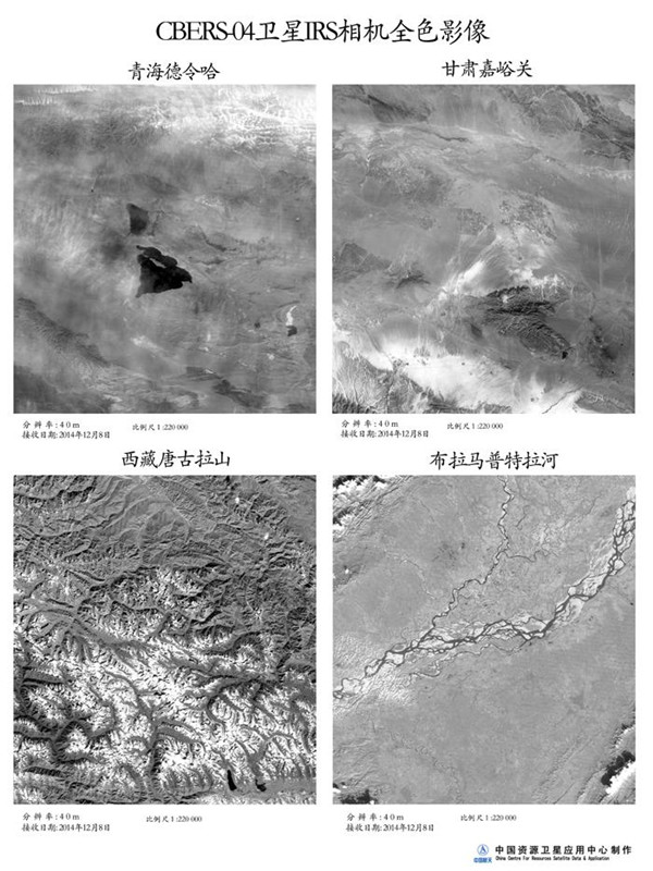 Panchromatische Aufnahmen von Delingha in der Provinz Qinghai in Nordwestchina (oben links), Jiayuguan in der Provinz Gansu in Nordchina (oben rechts), den Bergen Tanggula in Tibet (unten links) und dem Fluss Brahmaputra in Tibet (unten rechts), aufgenommen mit der PAN-Kamera. |
