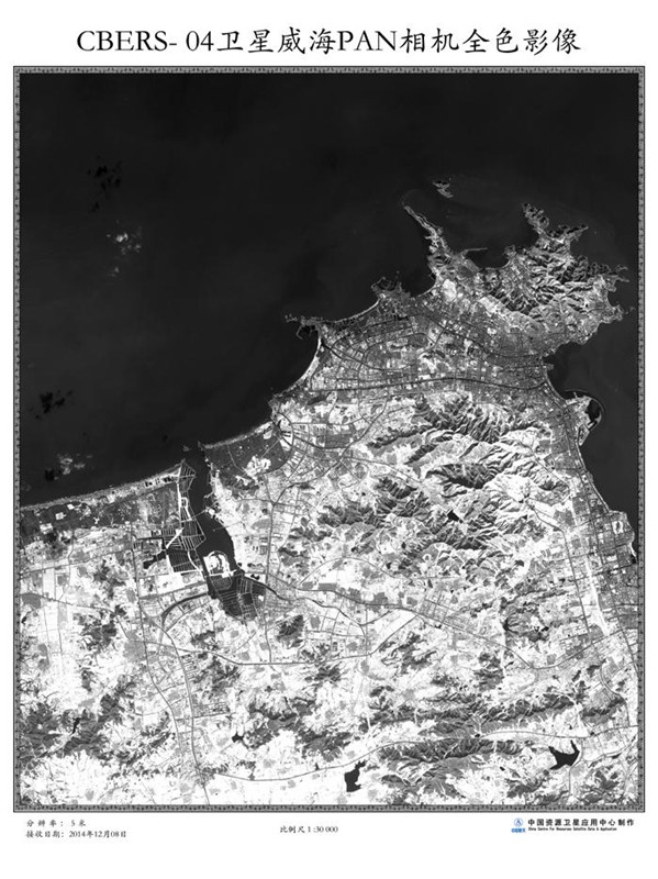 Eine panchromatische Aufnahme von Weihai, aufgenommen mit der PAN-Kamera. |
