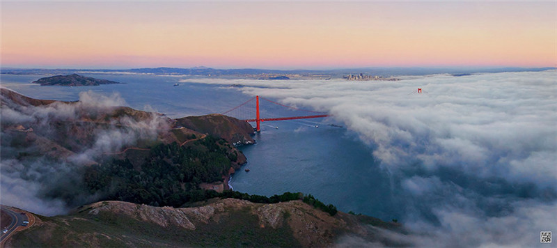 San Francisco. Die Golden Gate Bridge (auf Deutsch: Goldenes-Tor-Brücke) wird die meiste Zeit von dem Hebel beherrscht. Der Kameramann hat eine der wenigen Chancen ergriffen, sein Panoramabild aufzunehmen. |