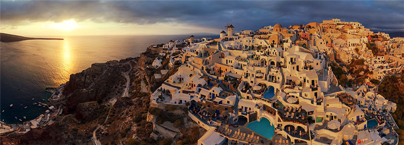 Santorini. Die griechische Insel ist ein global bekannter Urlaubsort. Auf der ganzen Insel gibt es kein Auto. Die Bewohner kennen als Verkehrsmittel nur Maulesel, was diesen Ort noch einzigartiger macht. |
