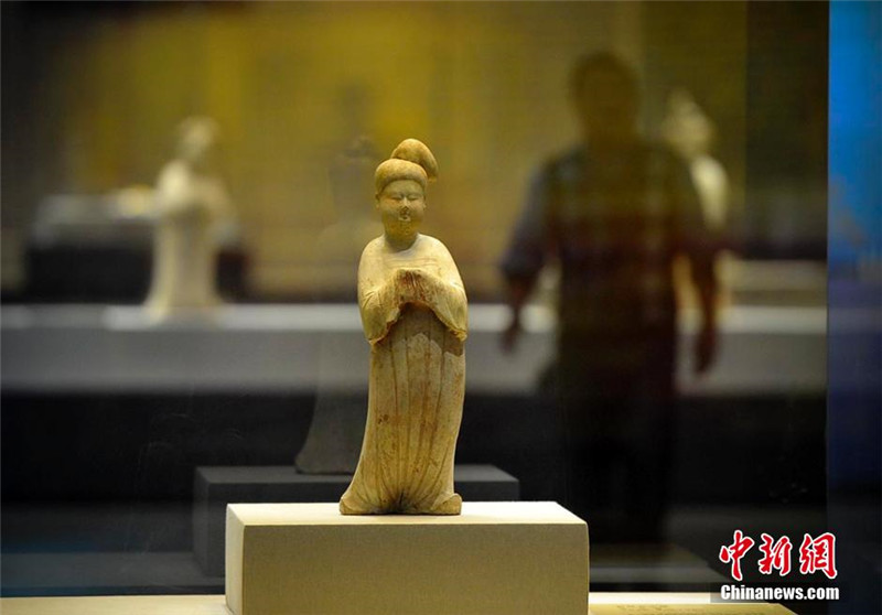 Die Besucher bestaunen die bunten Tonfiguren der Palastdamen in der Tang-Dynastie. |