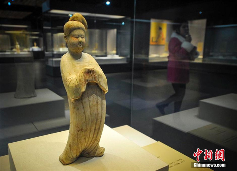 Die Besucher bestaunen die bunten Tonfiguren der Palastdamen in der Tang-Dynastie. |